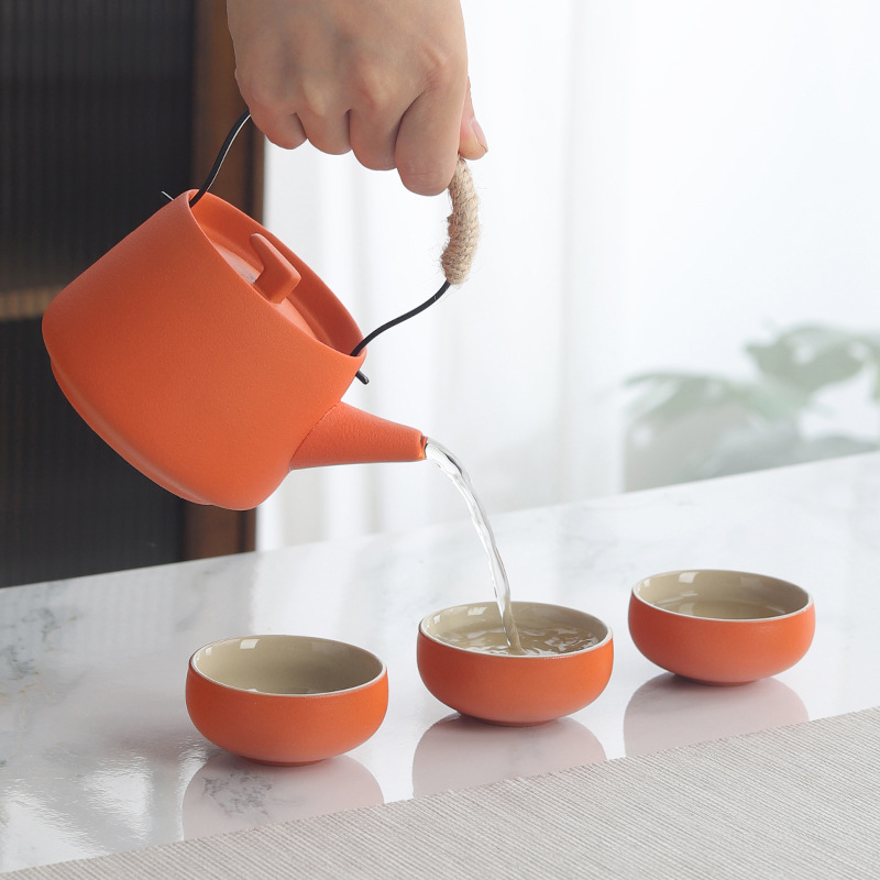 Елегантний керамічний чайний набір у теплих помаранчевих тонах, створений для затишних чаювань у колі близьких. Набір розрахований на трьох і включає чайник і три чашки, що ідеально підходять для заварювання різних видів чаю. Яскравий відтінок і витончені лінії роблять цей сервіз акцентом будь-якого інтер'єру, додаючи гармонію і тепло в атмосферу.